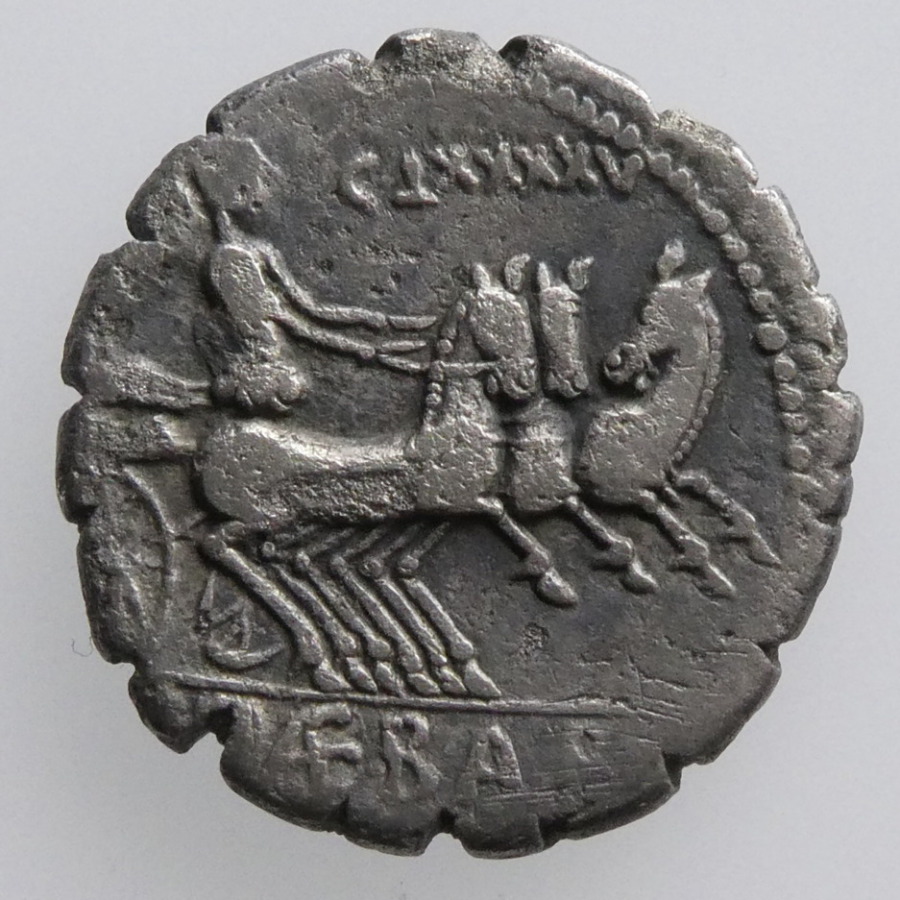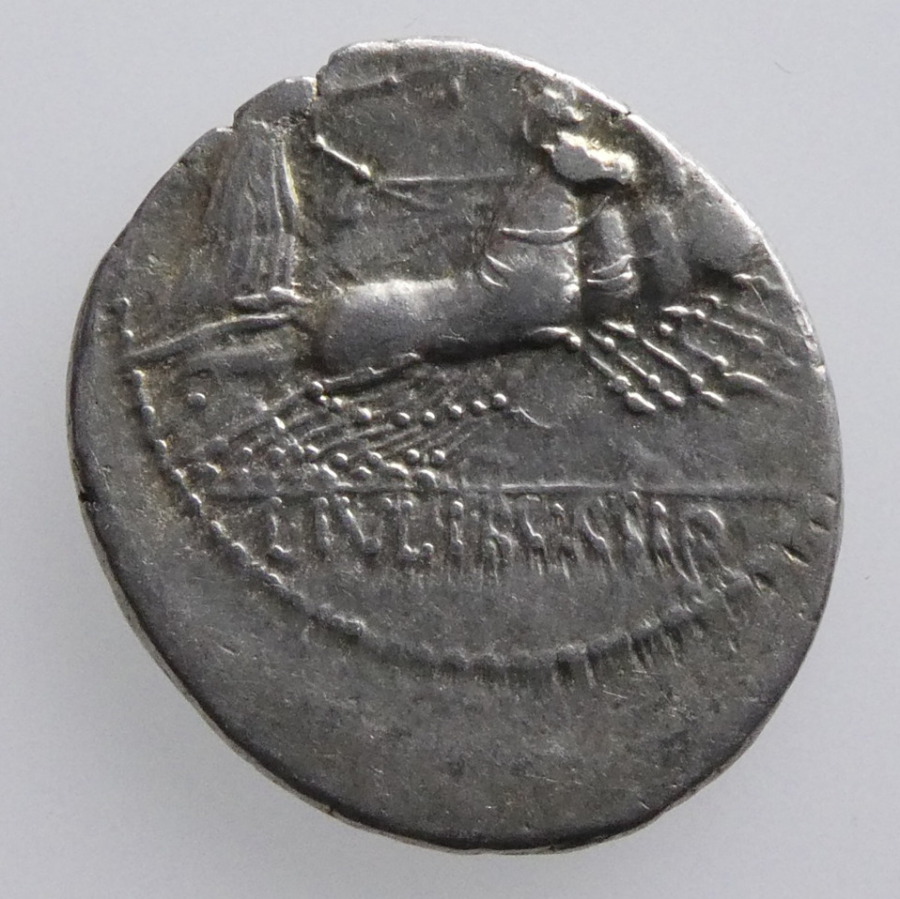 Reverse: Victory in quadriga galloping right, holding reins in left hand and wreath in right hand raised, :H control mark, [L] IVLI BVRSIO