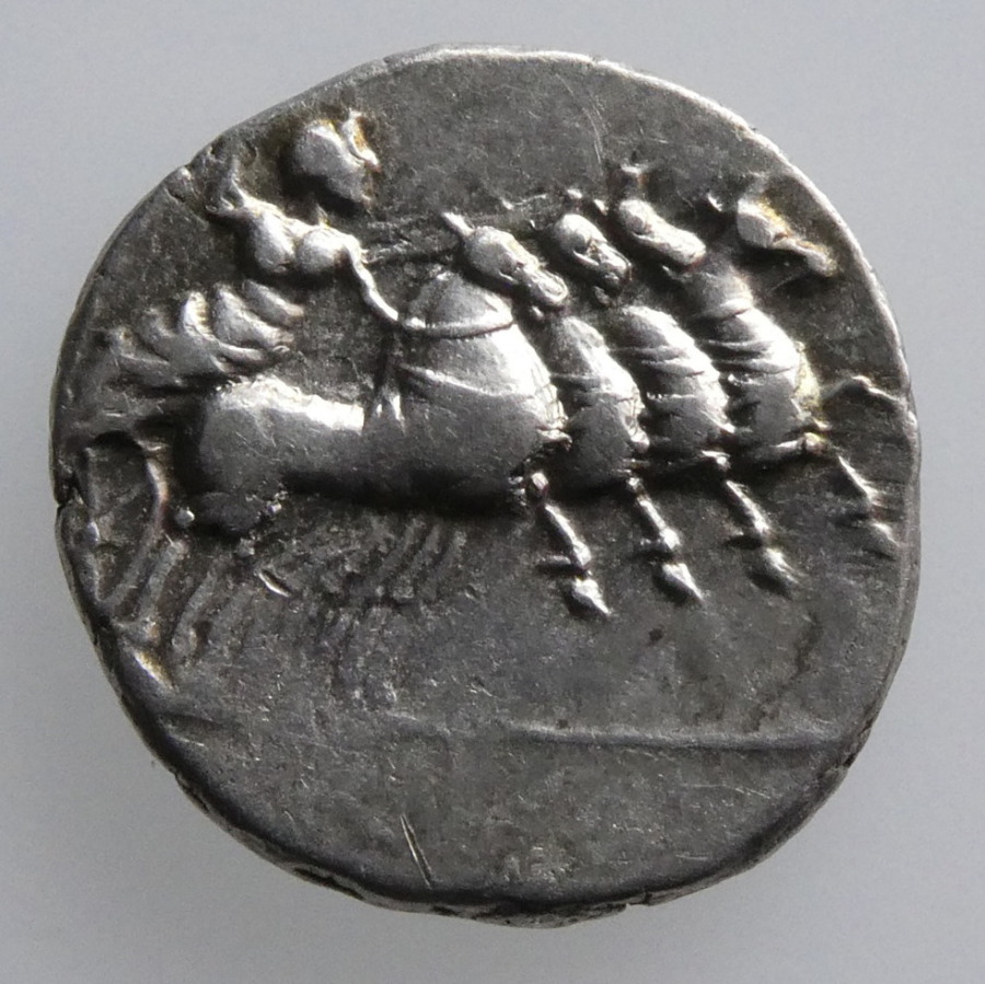 Reverse: Victory in quadriga galloping right, holding reins in left hand and wreath in right hand raised, L IVLI BVRSIO
