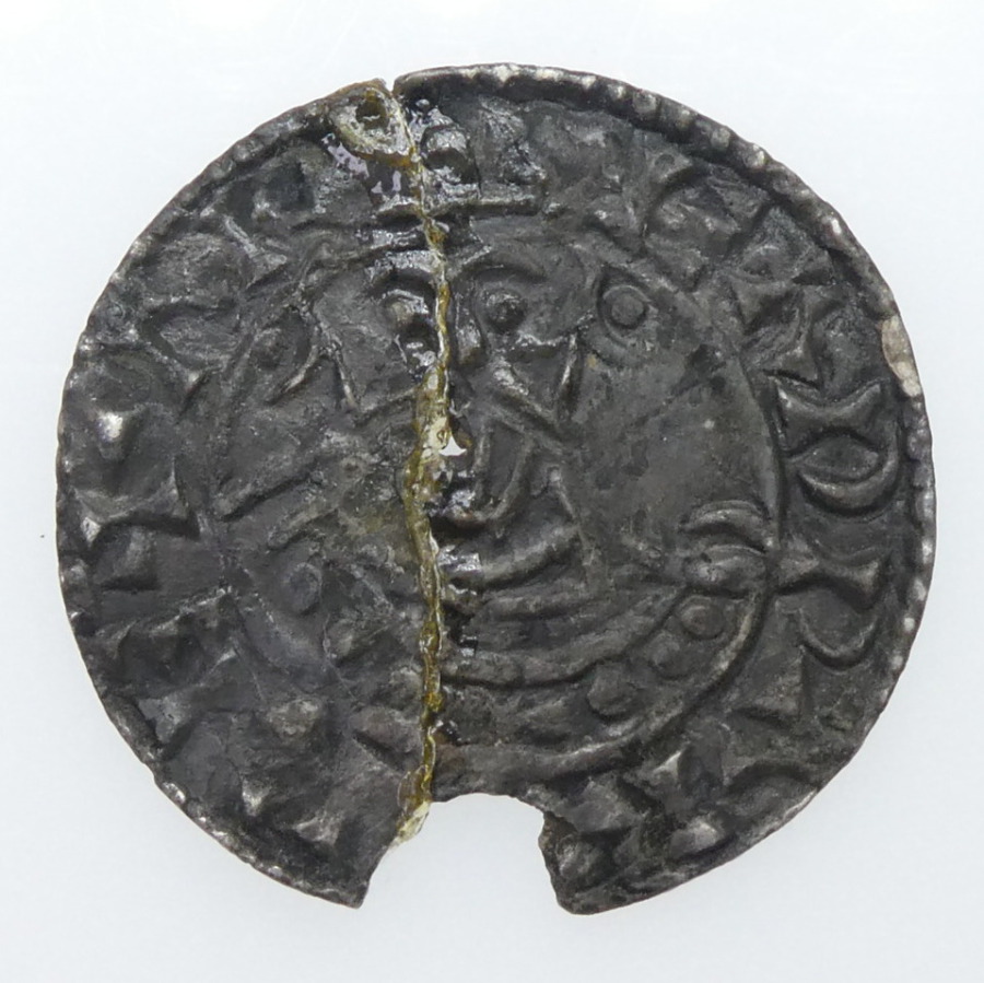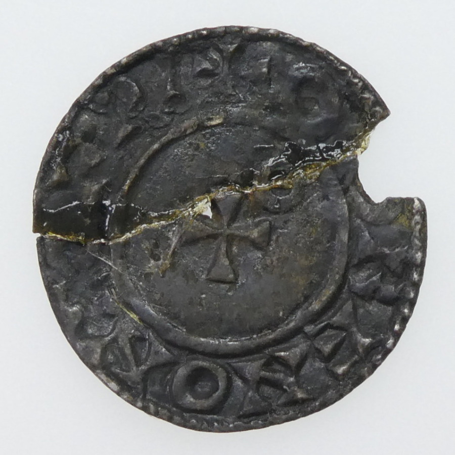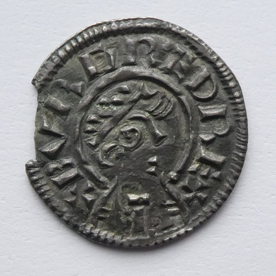 Reverse: Short voided cross, in each angle a pyramid springing from the inner circle and terminating in a pellet, +ÆLFPINE ON CIC