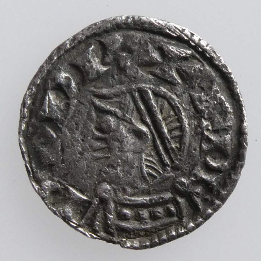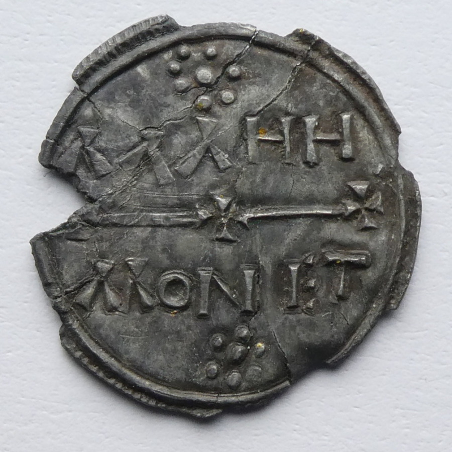 Reverse: Moneyer's name across two lines, central line and three crosses pattée between, rosette above and below, MANN MONIT