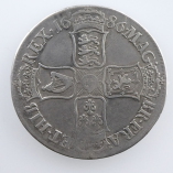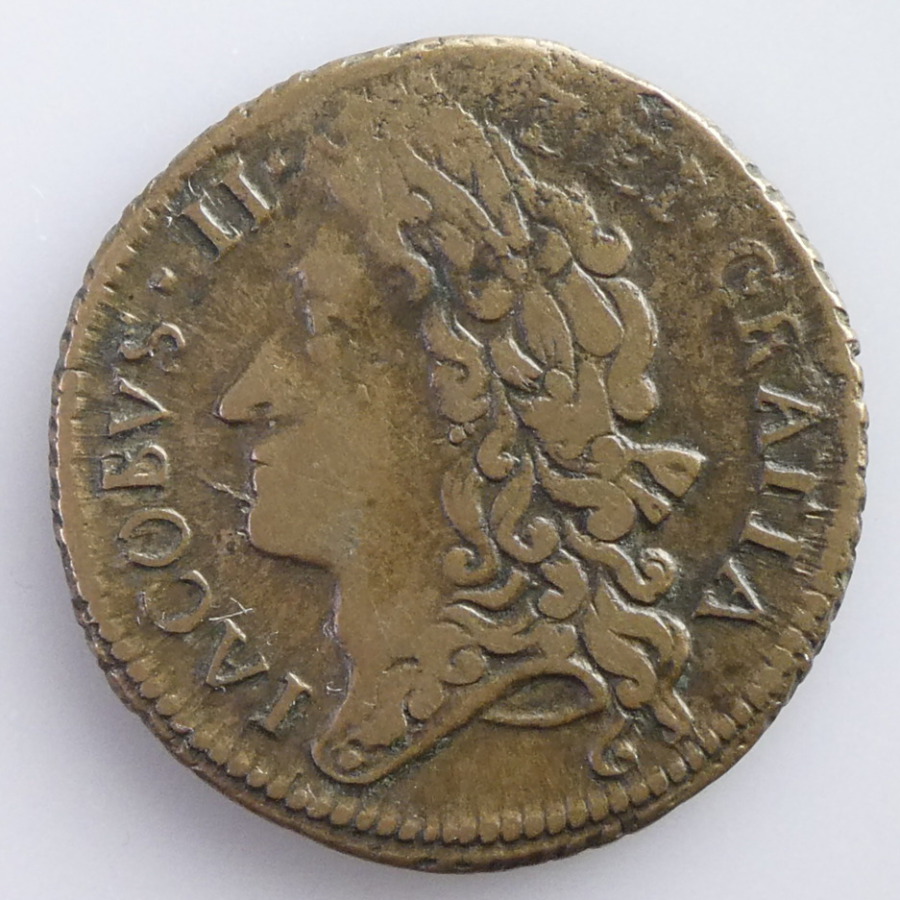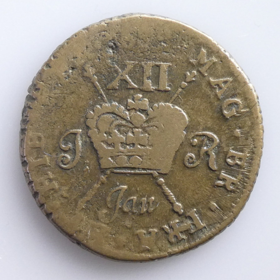 Reverse: Crown over sceptres dividing JR, XII above, Jan below (month of issue), 1689 MAG BR FRA ET HIB REX