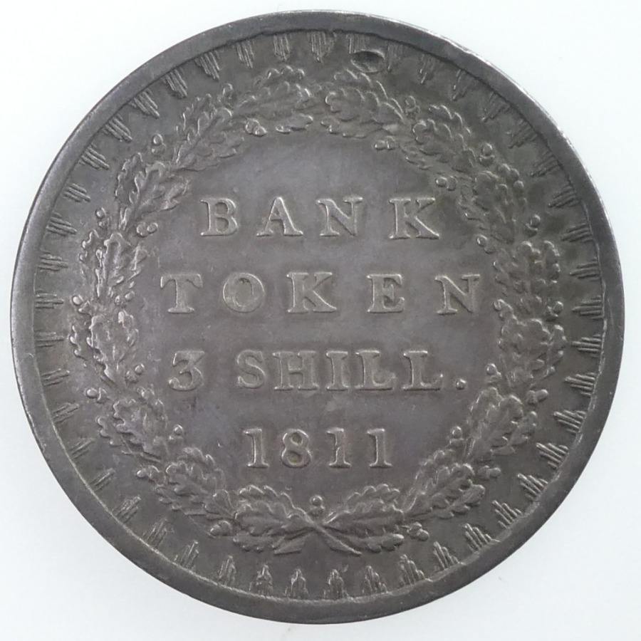 Reverse: Wreath of oak surrounding BANK / TOKEN / 3 SHILL / 1811