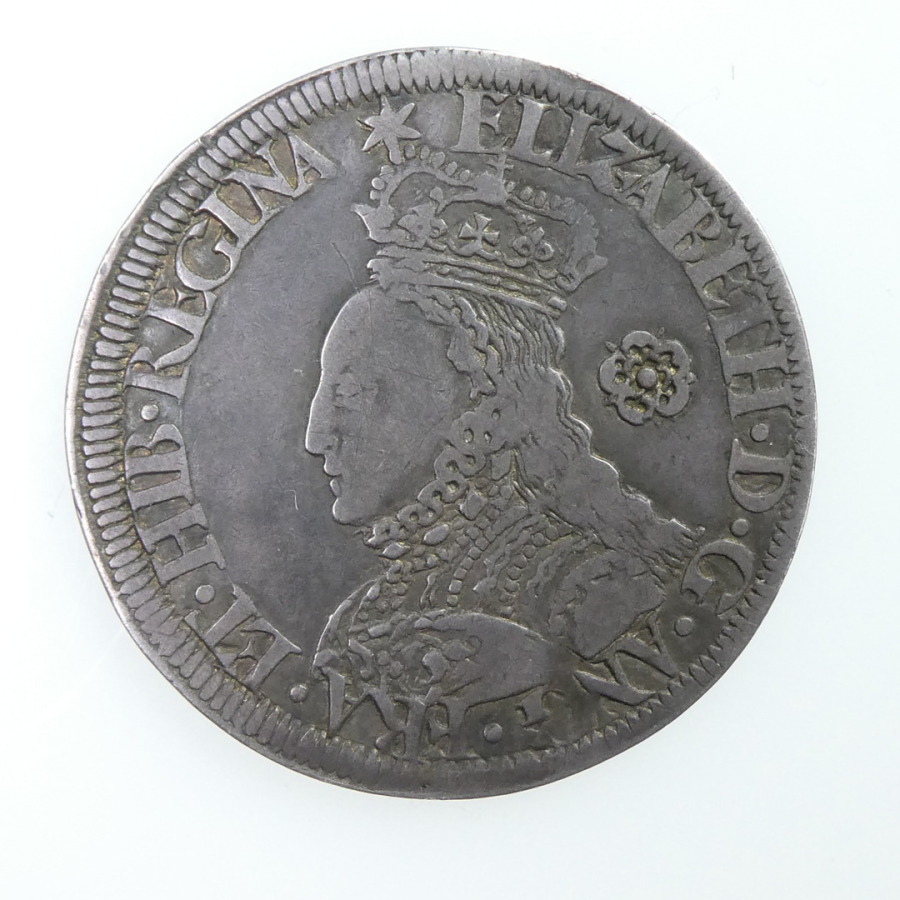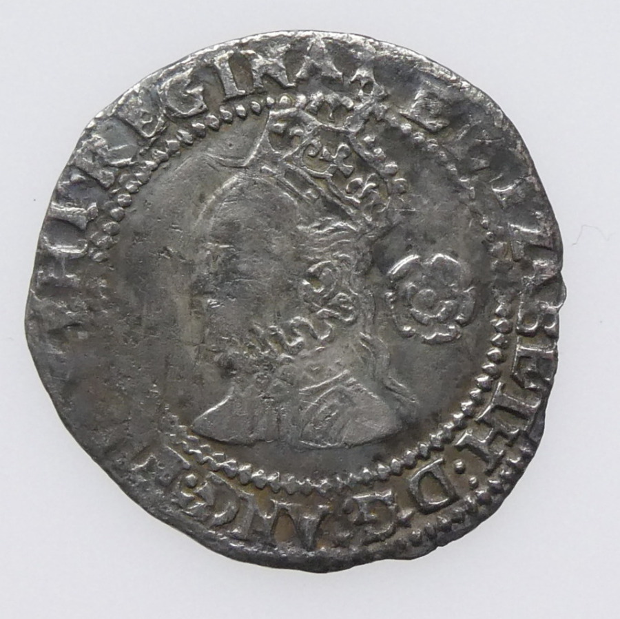 Obv: ELIZABETH D G ANG FRA ET HI REGINA, Pheon mint mark, small 1F bust, Tudor rose behind