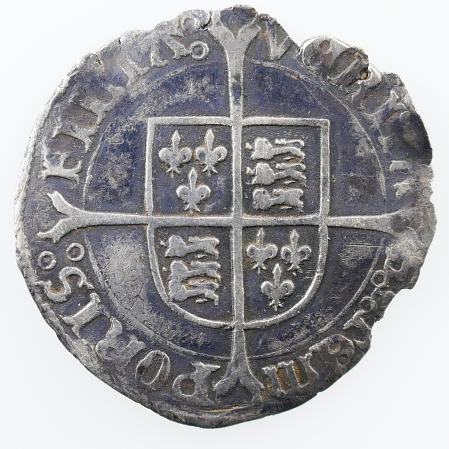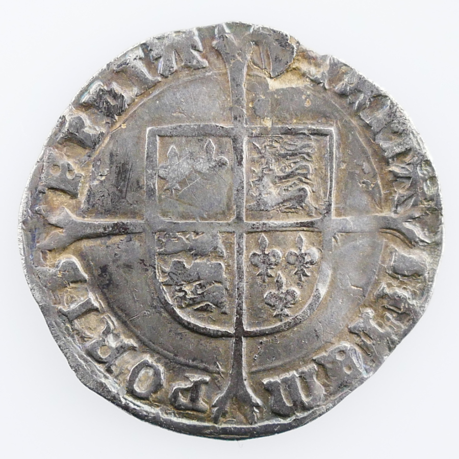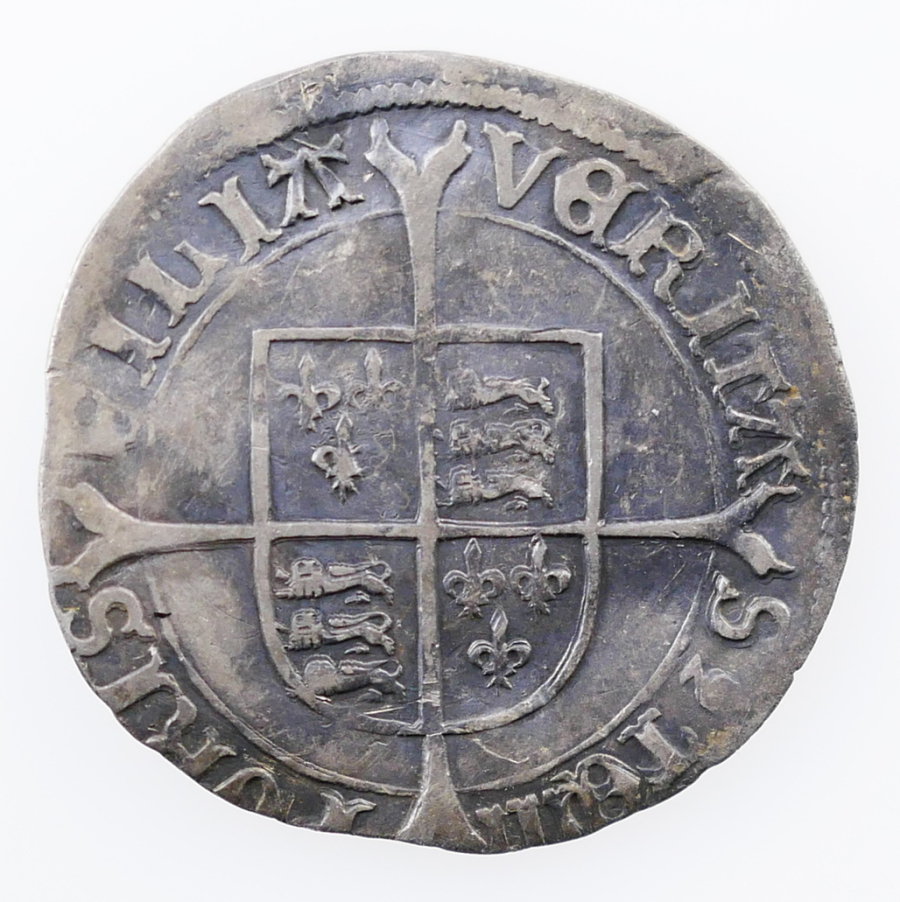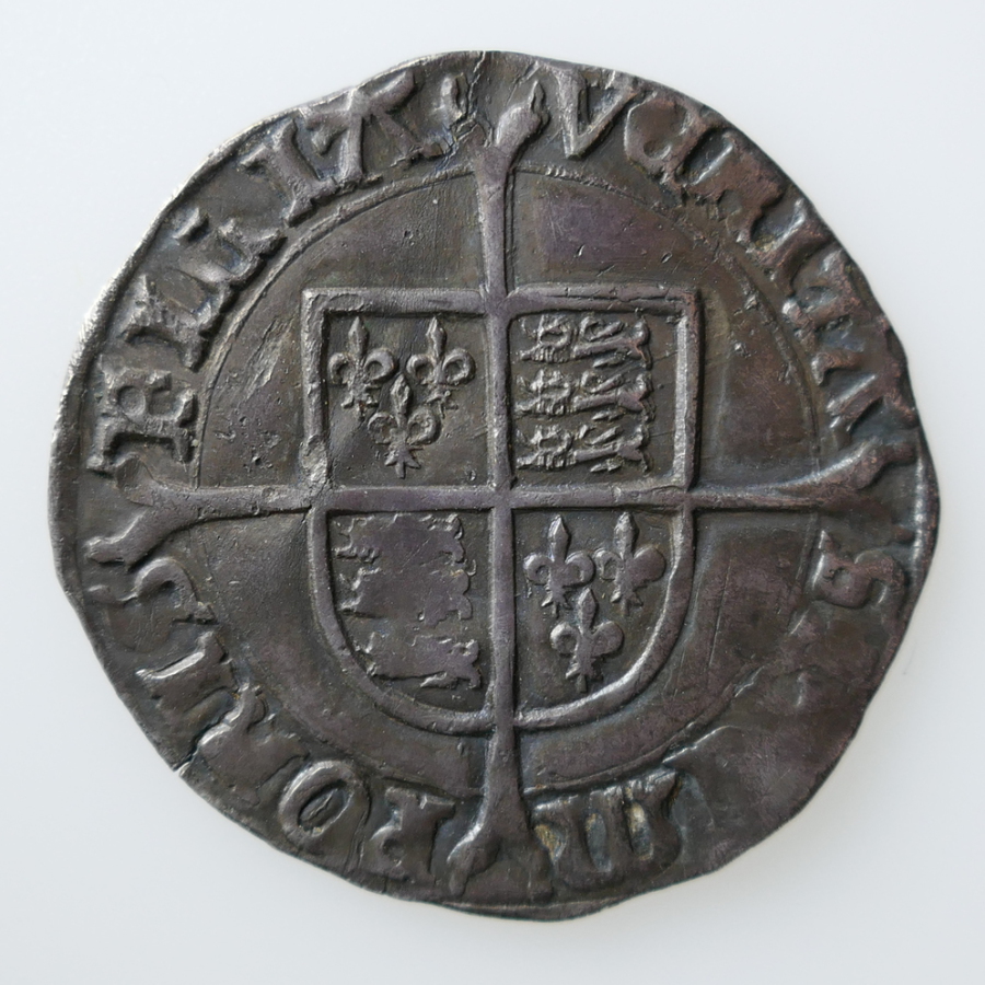 Reverse: Quatered shield-of-arms over long cross fourchée, VERITAS (pomegranate) TEMPORIS FILIA