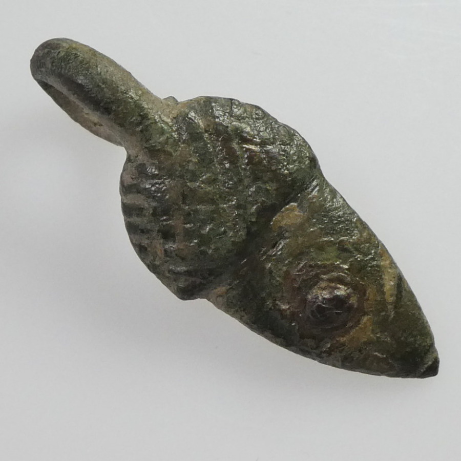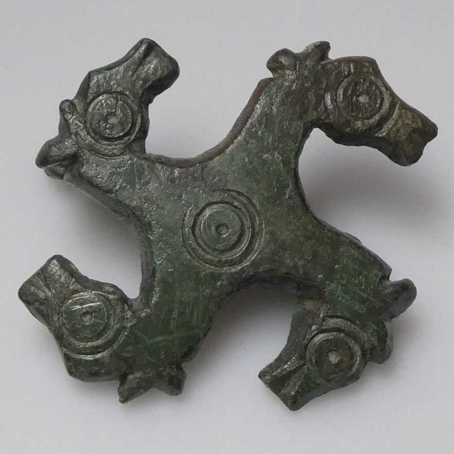 A lovely fibula with a green patina with the ends of the garment clips are shaped like horse heads. Concentric circle decoration can be found on each horse and in the centre. The alternative name for this plate brooch is the ‘swastika’ which originally was a Sanskrit word for ‘well-being’ and in this direction would have been a Hindu symbol of the sun. Catchplate & pin lug present, pin missing, as is typical.