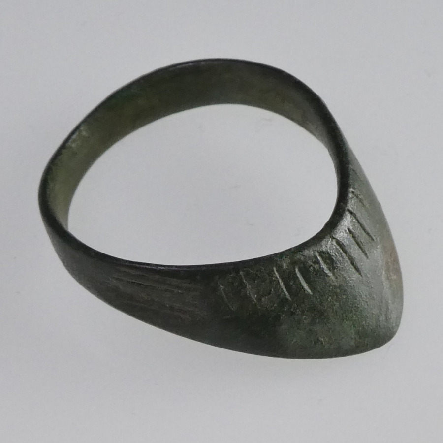 Medieval, copper-alloy archer's ring, decorated with incised lines.